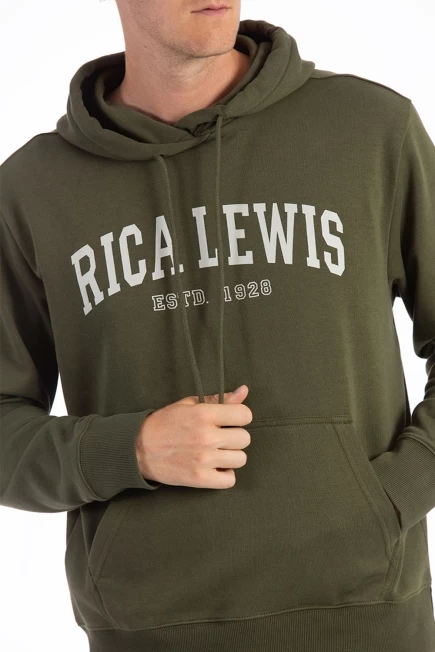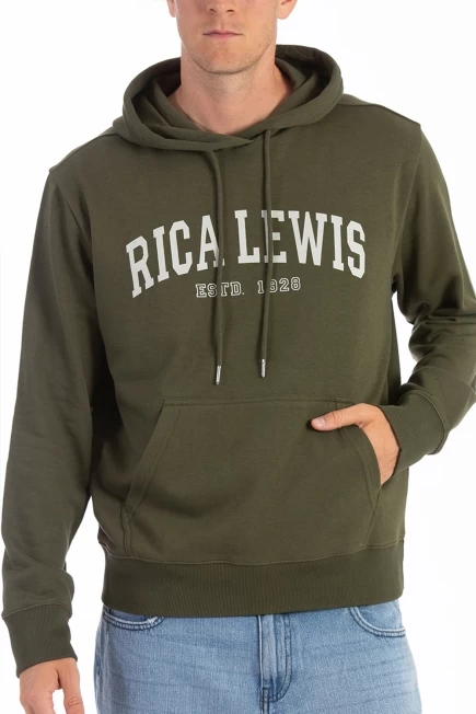 Sweat-shirt signature à capuche, molleton brossé , capuche avec cordon de serrage, coupe droite, bas et poignets côtelés, poche kangourou. Intérieur de la capuche et encolure en jersey bleu chiné avec un effet denim texturé. Imprimé signature Rica Lewis sur le devant. 65% coton 35% polyester.